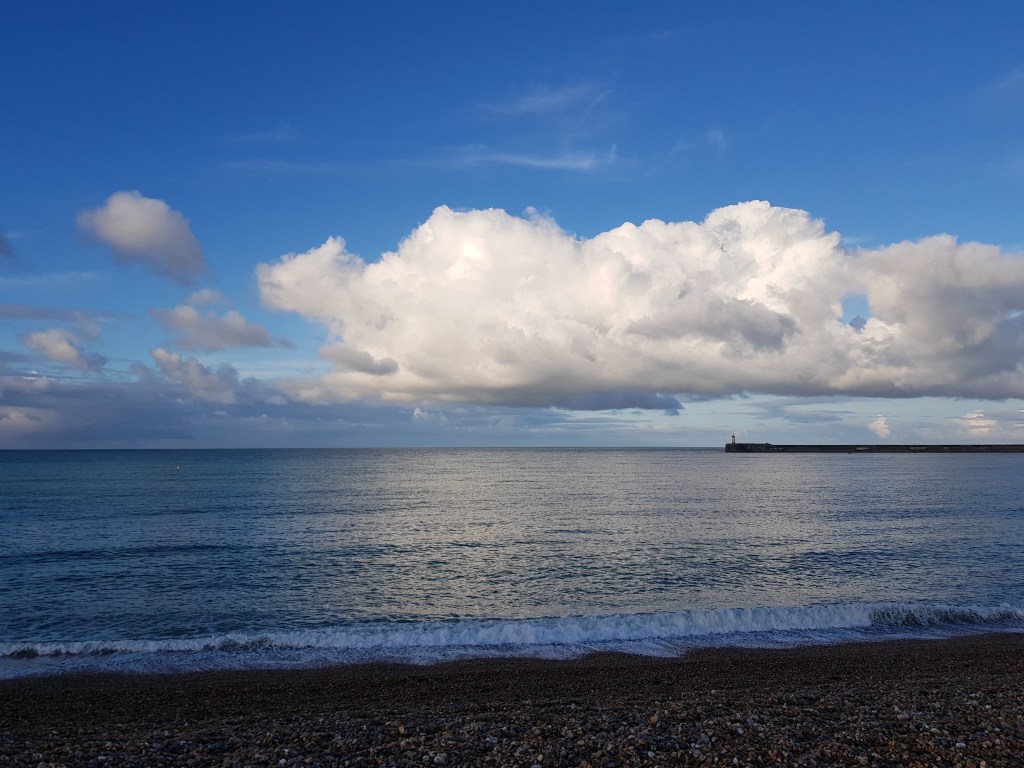 These moments, experiences or happenings have now become regular, each quietly overwhelming or increasingly profound in different ways. I realise that I can perch at the edge of the water here and, in turns, all time becomes Now. Salt on my skin, and the sea air in my nose. The horizon fizzes – starts to feel particular. The clouds become timeless; become the same clouds I have looked at since arriving in this world – rolling, turning, folding, dissipating, building, streaking, patterning themselves. One day – subtle shifting formica patterns. The next; a chevroned pattern shuttering above me as if a celestial tractor tyre has imprinted its tread across the sky.